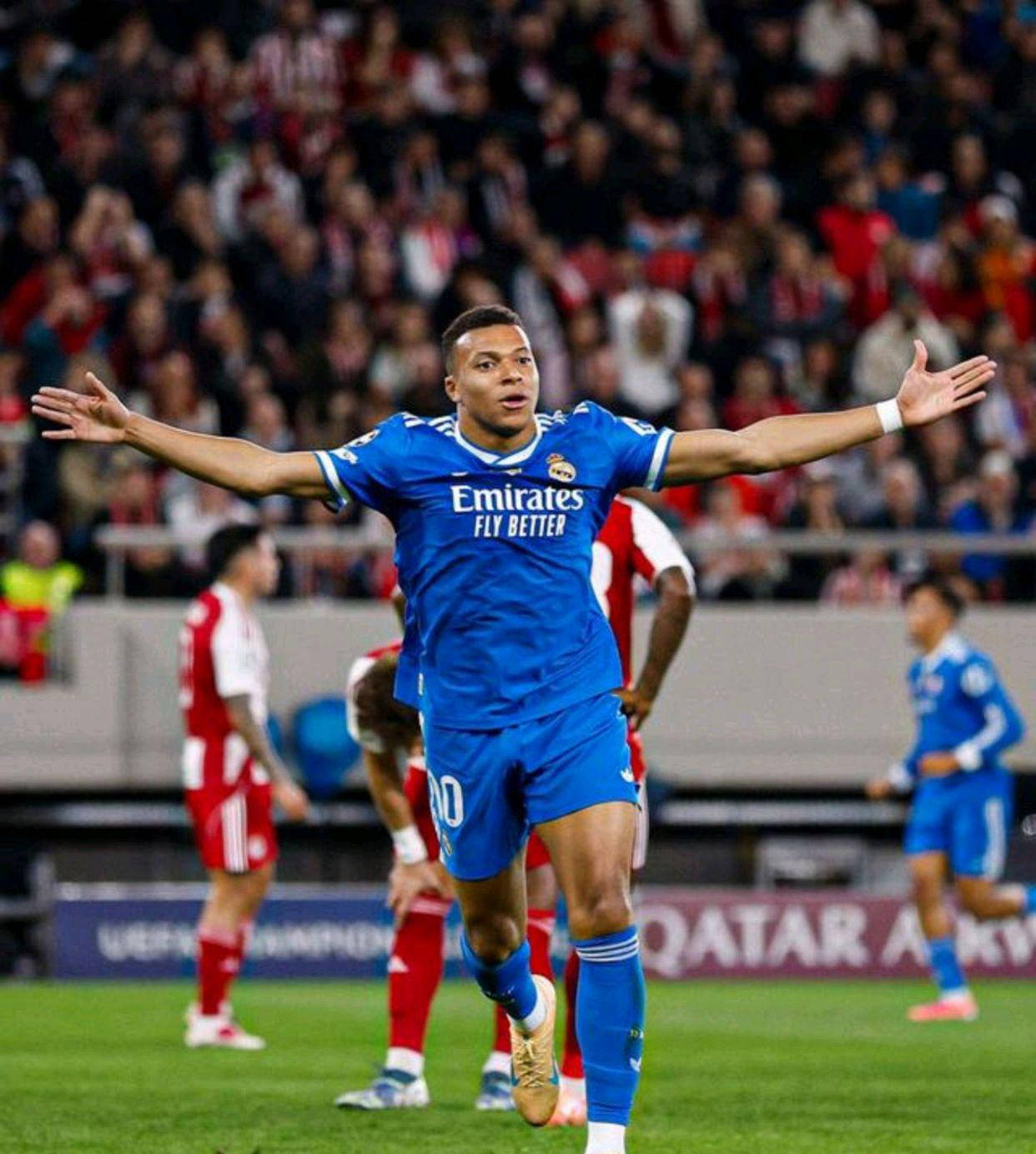 比赛伊始,姆巴佩便显露出极强的进攻欲望。比赛刚开始,他充分利用自身速度优势多次撕裂奥林匹亚科斯防线,让对方后卫疲于奔命。第23分钟时,他在禁区前沿接队友精准直塞,巧妙变向晃过防守后冷静推射远角,为皇马首开纪录。这粒进球开启了他的得分账户,不到8分钟,他在反击中表现出惊人爆发力,从中场一路带球冲刺,在门将出来挡抢前挑射得手,将比分扩大为2-0,展示了无与伦比的速度和技术。